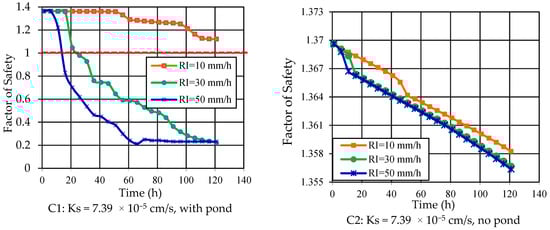 For Ks = 7.39 × 10−5 cm/s, the FOS obviously decreased in the rainfall boundary with a pond (Figure 10C1), but that changed only slightly in the case of a boundary with no pond (Figure 10C2). In the case with a pond, the FOS decreased as the rainfall intensity and accumulation increased from 1.38 to 0.2. At higher rainfall intensity, riverbank failure occurred quickly. Riverbank failure occurred after 16 h and 26 h for rainfall intensities of 50 mm/h and 30 mm/h, respectively. In the case of no pond, the FOS decreased indistinguishably in small ranges with all rainfall intensities from 1.37 to 1.35, and the riverbank was stable after five days of rain.