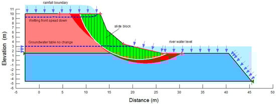 A riverbank is a special slope that relates closely to hydraulic dynamics, not only from rainfall infiltration from the surface concerning the space above the slope, but also significantly from the fluctuation of the river water level and groundwater table [,,,,,,,]. Past research works assessed the effects of rainfall on riverbank stability using the indirect process of transient seepage due to water level changes and assumed that rainfall has no effect on the riverbank surface.