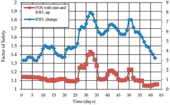 The effects of multiple rainfall events and RWL in the rainy season are shown in Figure 14. The change in FOS was nearly the same as the change in RWL, which meant that the FOS increased with the increase in RWL, and the FOS decreased with the decrease in RWL. These results agreed with those of previous studies [,,,], which studied the effect of RWL on FOS. When the riverbank had a soil hydraulic conductivity lower than 10−4 cm/s, the FOS always depended on the change in RWL because of confining pressure []. The effect of rainfall on the riverbank was insignificant compared with the effects of changes in RWL. The results from the long-term analysis during the rainy season showed that low-intensity rainfall (less than 140 mm/day, average 5.8 mm/h) caused the FOS to decline at a low rate. Riverbank failure occurred only when the riverbank had a high slope and had cracks in the riverbank surface. In fact, there was a high slope angle and some cracks along the riverbank in the study area. In general, a riverbank with a high slope angle and some cracks has a high potential of failure during the rainy season. Moreover, the change in RWL was the factor with the greatest influence on the FOS of the riverbank. The riverbank was more damaged when multiple factors occurred together.