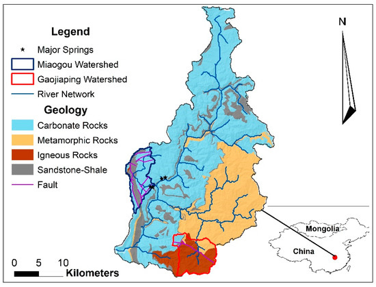 Gaolan River basin is located in Xingshan County, western Hubei Province, Southern China. It is characterized by a subtropical monsoon climate with abundant rainfall that averages 900–1200 mm annually. These climate parameters have a direct influence on the karst geomorphology since karstification process is water dependent. The two case study watersheds, Miaogou and Gaojiaping, are less than 9 km apart from each other in Gaolan River basin. Miaogou karst watershed is underlain by a well-developed karst terrain with a surface elevation that ranges between 430 to 1770 m.a.s.l. The predominant carbonate rock in the area is limestone of Cambrian age, which appears like rounded hills or isolated towers (typical of tropical karst). Non-carbonate rocks present in the area are mudstone and shale of Silurian and Lower Cambrian ages, respectively (Figure 1). The karst areas are characterized by large depressions, sinkholes, caves, and several springs, some of which are shown in Figure 2. The landcover is predominantly a mixture of Agriculture land and Evergreen Forest. Gaojiaping (non-karst) watershed has about 75% of its entire catchment underlain by an igneous rock while 15% and 10% is metamorphic and carbonate rocks, respectively. The exposed igneous and metamorphic strata are mainly Proterozoic where the igneous comprises of granite and diorite. The metamorphic rocks are comprised mainly of slant gneiss, graphite gneiss, gneiss, and granulite. This composition collectively forms the ancient crystalline basement in the area where the landcover is mainly evergreen forest.