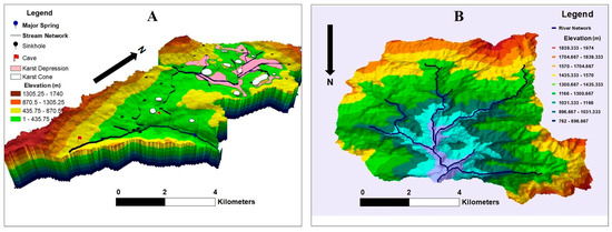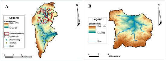 3D Geomorphometric illustration (A) Miaogou watershed characterized by an elongated shape with the presence of spring, sinkholes, caves, karst depressions and karst cones (B) Gaojiaping watershed characterized by a broader fan-shaped area with no karst features.
