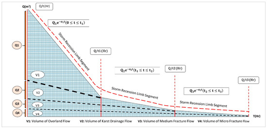 Schematic presentation of the hydrograph recession limb with four recession segments and corresponding volumes of discharged water (adapted from Kresic N. and Bonacci O. [39]).
