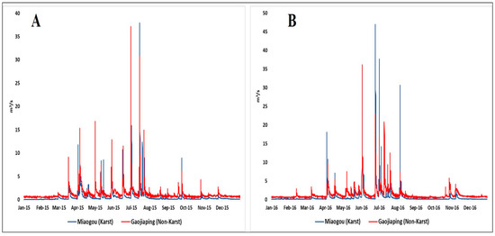 Streamflow data for Miaogou and Gaojiaping Watersheds for 2015 (A) and 2016 (B).