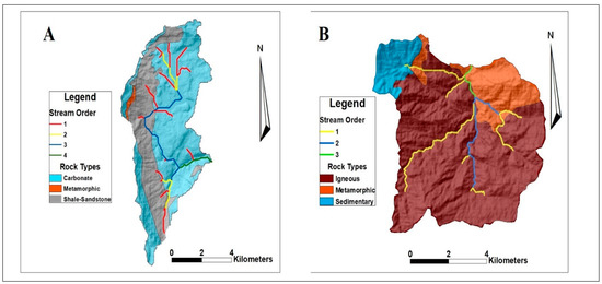 Stream network order (Strahler Order, [30]) of Miaogou (A) and Gaojiaping (B) watershed.