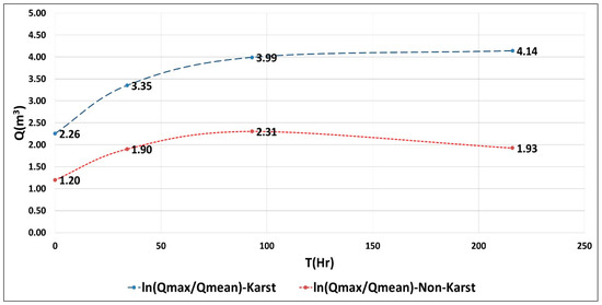 Figure 10 also shows the variability discharge ratio ln(Qmax/Qmean) of the karst watershed to be much higher by an order of nearly two magnitudes. In addition, the karst discharge variability shows an exponential growth from 2.26 to 4.14 in about 220 h whereas the non-karst discharge, at about 220 h begins to decay rather rapidly. The variability discharge ratio has often been used to determine the “flashiness” of a spring, which distinguishes diffuse (slow) and conduit (fast) flows [46].