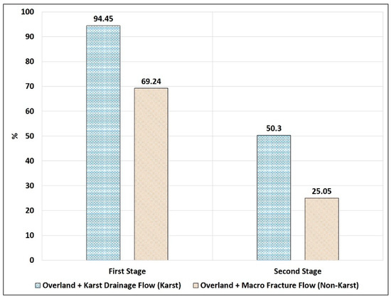 Three typical storms characterized by low, medium, and high volumes of stream discharges were selected for the streamflow components separation. This is to have a balance between dry period and wet periods during the hydrologic year. Using Equations (5)–(7), as well as the recession coefficients generated in Table 2 and Table 3, respectively, the streamflow recession segments and their respective volumetric flows, computed. The initial and steepest part of the recession should characterize a different hydraulic flow type, as it generally reflects the fall of the hydraulic head in the conduit network. This is because the hydraulic behavior depends on two main hydraulic heads which characterize karst aquifers, and connected to the peculiar structure of the medium [47]. The result, shown in Table 4 and Table 5 were quantified based on the function that higher recession coefficient implies higher water drainage capacity per unit time which is primarily attributed to topographical and geomorphological characteristics. The geology is particularly critical here since it defines the drainage porosity which in effect is more impactful after the first overland discharge. Also, the function of the aquifer specific yield is known to be given by the ratio of the volume of water drained to the rock volume. Hence, for Miaogou, we defined four (4) classes of flow regime that contribute to streamflow; (1) overland flow, (2) karst drainage flow, (3) medium fracture flow and (4) micro fracture flow. For Gaojiaping the classes are (1) overland flow, (2) macro fracture flow, (3) medium fracture flow, and (4) micro fracture flow. The streamflow separation results show that overland flow and karst drainage flow have the largest percentages for all three storms that were evaluated. This phenomenon correlates well with the drainage characteristics of karst aquifers having multiple porosity structures due to karstification [48]. Conversely, in Gaojiaping, micro fracture flow, which is generally through regolith deposits and soil sediments contribute the most significant percentage of water ratio. Thus we can conclude that the aquifer matrix of the non-karst basin is more homogenous than that of the karst basin. When the volumes of each stream component are examined and contrasted between the case areas, the disparity becomes apparent. For example, Figure 11 shows the disparity in combined overland and karst drainage flows when compared to the overland, and large fracture flows in between the case study areas. In the first stage of the recession, there is a difference of about 40 m3 while the second stage has a difference of about 30 m3. This implies that the karst watershed tends to discharge larger volumes of water per unit time over the surface as well as subsurface at nearly the same rate. Bonacci [44] elucidated this phenomenon with cases from Switzerland and France [49] and Russia [50] as well as other parts of the world [12], which show that the water retention capacity in karst areas may not be great. This corroborates the findings in this study, even though, the high surficial flow observed in Miaogou, is not primarily attributed to any particular karst feature but more to the basin geometry and morphology, which are ultimately defined by the underlying carbonate system. Hence, there is an indirect correlation but it is merely circumstantial since other geological formations can produce basins geometries that discharge runoff quickly.