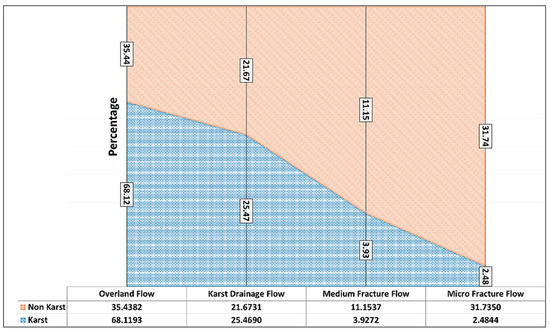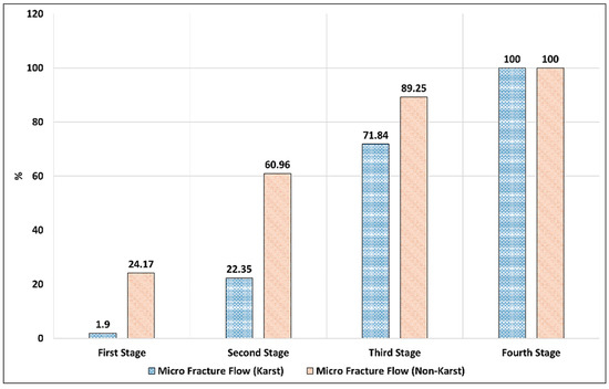 Similarly, Figure 12 shows the disparity in micro fracture flow for both watersheds where the non-karst catchment has a larger volumetric discharge rate. This property of non-karst watershed is even more pronounced during the wetter phases beginning from the first stage through to the third stage which is drier due to the absence of precipitation. From Figure 11 the drainage volumes for all for flow types for each of our case study areas and stacked against each other. It can be concluded that the karst watershed has a faster and more robust drainage system due to the impacts of topography and especially geomorphology, as exemplified by the karst drainage attributes (KDA) such as caves, sinks, and closed depressions. The non-karst watershed, on the other hand, has the potential to hold more groundwater reserves despite being a crystalline hard rock formation.