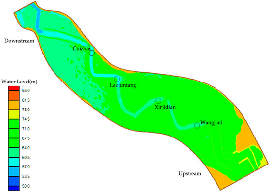 The mathematical model calculation involves the selection of many calculation parameters. The selection of calculation parameters, such as roughness coefficient, turbulent viscosity coefficient, and calculation step length in the two-dimensional flow mathematical model affect the calculation process and calculation results. The average flow velocity of the natural river channel is related to the hydraulic radius, river ratio drop, and roughness coefficient. It is somewhat similar to the ground friction coefficient. The lower the roughness, the higher the flow rate. The determined roughness factor is, therefore, a defined value for determining the flow rate and other relevant parameters. Therefore, the value of roughness coefficient n in the calculation process is: Main channel, , floodplain . Termination of the turbulent viscosity coefficient of the water flow is based on the zero-equation turbulent model, , where is the friction flow rate, α is constant, and generally α is 1–10. This paper calculates the step length as Δt = 10–30 s.