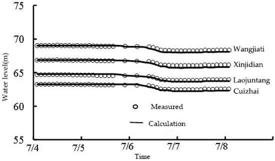The measured water level data for the four Hydrographic stations in July 2014 are used to verify hydrological data. In the process of verification and calculation, the flow hydrograph is used in the upstream section and the water stage hydrograph is used in the downstream section as the boundary condition. The calculation time step takes s; the critical depth dh of the exposed beach takes 0.1 m. The relevant calculation parameters, such as roughness coefficient, turbulence viscosity coefficient, and length of calculation time, are determined by rate determination; the results are shown in Figure 3. It can be seen from the figure that the calculated value is basically in agreement with the measured water level process, and the error meets the requirements of the specification. It can be seen that the model calculation better simulates the process of water level change along the course, reflecting the comprehensive resistance effect of the river channel.