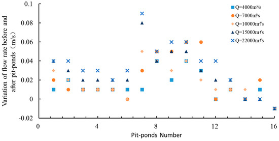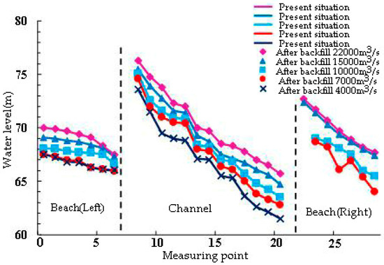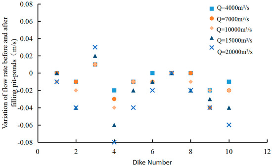 In order to analyze the impact of pit-pond backfilling on the water level, 27 water level measuring points are selected along the main channel and on both sides. The water level changes before and after the project are shown in Figure 4. It can be seen that there is almost no change in the water level before and after the project under various hydrological conditions. Under the condition of Q = 22,000 m3/s floodplain, the maximum water damming height in the pit-ponds area is less than 0.03 m, indicating that the backfilling of the pit-ponds has less effect on the flood level of the river.