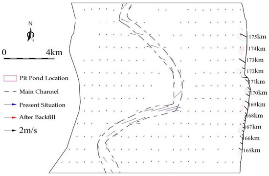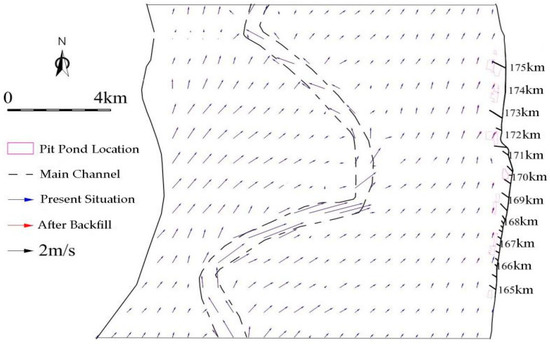 The distribution of cross-sectional velocity before and after filling the pit-ponds under Q = 7000 m3/s and 22,000 m3/s flow is shown in Figure 9 and Figure 10. It can be seen from the figure that the axis of hydrodynamic force has not changed basically after the implementation of the project. Only the local range velocity of the pit-pond backfilling area has been slightly adjusted, and the change of flow velocity in other areas is small.
