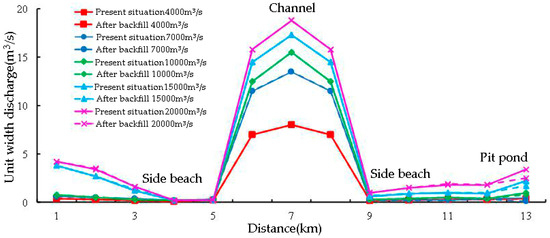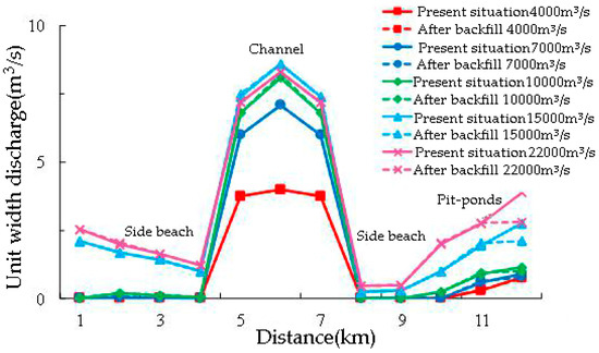 The two flow sections of the pit-ponds area are selected to analyze the impact of backfilling. The location of the cross-section is shown in Figure 11. The single width flow distribution of the cross-section is shown in Figure 12 and Figure 13. It can be seen from the figure that the main channel under each flow is the main channel for floods. Due to the obvious horizontal ratio drop on the banks on both sides of the main channel, the single width flow is generally closer to the root of the dike under various operating conditions, while the single width flow on both sides of the dike is larger than on other parts of the beach land. After filling the pond, there is no significant change in the single width flow in the section, the main channel, and the beach areas on both sides. The local single width flow in the backfilling area decreased, and the amplitude is generally within 30%.