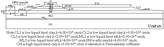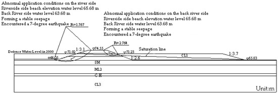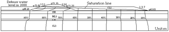 The operating condition of seepage calculation is shown in Figure 15. The water level of flood prevention is selected as water level on the riverside, while the ground elevation at the lowest point is selected as the water level on the back side. The results show that the seepage field of the dike is normal, the line of seepage does not escape from the slope surface of the silt area, and there is no seepage stability and safety problem on the slope surface. The total differential head between the front of the dike and the back slope of the dike is about 5.2–8.14 m. The seepage diameter at the contact surface of the dike is generally about 160 m, and the average falling gradient is about 0.051. The seepage stability of the dike satisfies the requirements. Due to the distance between the pit-ponds and the dike foot, there is no obvious effect on the seepage of the dike.