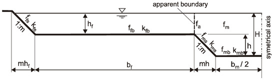 where: fa—apparent coefficient of resistance at the boundary between the main channel and floodplain area, fmb—resistance coefficient of the main channel bottom, fms—resistance coefficient of the main channel side slopes, fm—resistance coefficient in the main channel, ffb—resistance factor of the bottom of the floodplain, H—water depth in the main channel, hf—water depth in the floodplain, bm—bottom width of the main channel, bf—floodplain width, 1:m—aspect of the side slope of the main channel and floodplains, kmb—absolute surface roughness of the main channel, kms—absolute roughness of the main channel side slopes, kfb—absolute surface roughness of the floodplain, kfs—absolute roughness of the floodplain side slopes.