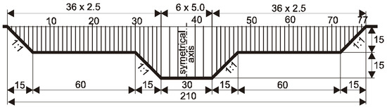 The channel with a compound trapezoidal cross-section was 16 m long and 2.10 m wide (Figure 2). The bottom of the main channel and symmetrical floodplains in the cross-section were horizontal. The channel model was supplied by five pumps with a total discharge of 0.50 m3/s in a closed water cycle. In the initial section of the channel, a row of 0.30 m long PVC (Polyvinyl Chloride) pipes was laid, calming the flow, and directing water into the model. At the end of the channel, a tilting gate for controlling the water levels was mounted, which was used to force a steady uniform flow into the channel. Measured values were the water depths in the main channel and in the floodplains, the flow velocity at the cross-section points, the water temperature, and the flow rate in the channel. Measurements of the water flow velocity were carried out in a section located halfway along the channel. To measure the velocity components, an 11 × 33 mm ellipsoid electrostatic PEMS was installed on a sliding measuring carriage. Spot velocity measurements were carried out with an accuracy of 1 cm/s in 77 measuring profiles (Figure 2), and in nearly 500 cross-section points. The required length of the measurement time series for the longitudinal velocity was determined in the respect of an error of the calculated mean longitudinal velocity, with an allowable absolute error of the mean velocity of δ = 1 cm/s. It was found that the velocity should be measured 50 times, in order to give a 5 s measurement period with 0.1 s interval, using the electromagnetic probe. The water depths were measured with a pin gauge having an accuracy of 0.1 mm. To measure the flow rate in the channel, a calibrated circular measuring overflow with a diameter of 540 mm was used. The water head on the length of the channel was measured with a differential pressure gauge, based on the difference in water levels in piezometers located in the bottom axis of the main channel, at a distance of 4.0 m and 12.0 m from the beginning of the channel. The electro-probe and differential pressure gauge were connected to a computer measurement logger.