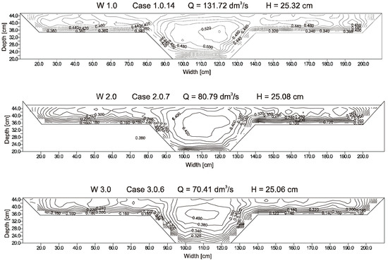 On the basis of spot velocity measurements it was possible to plot lines of constant velocities (isovels) in the cross-sections of the channel. Examples of isovels for the experiment variant W 1.0, W 2.0 and W 3.0 at similar water depths are shown in Figure 4.