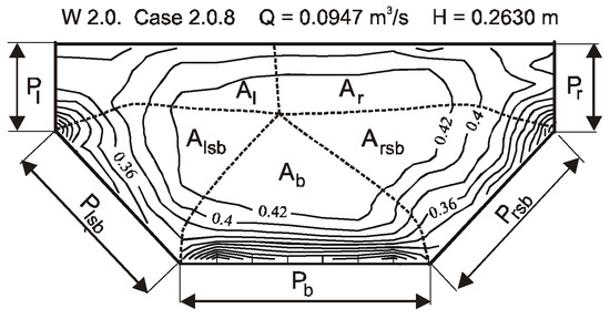 The values of dimensionless resistance coefficients in the main channel with different bottom and slope roughness, as well as resistance factors fa in the plane of distribution of the cross-section of the channel, were calculated using the Einstein method (1934) [18]. According to this method, for each surface roughness along the perimeter of the cross-section the flow area can be found, in which this roughness shapes the flow conditions. The area can be determined using the graph of isovels in the cross-section of the main channel. The division of the cross-section into these areas is carried out with lines perpendicular to the isovels, starting from the wetted perimeter points, separating the perimeter into sections with different roughness (Figure 5). This technique for determining division lines assumes that they are free from the shear stress, and forces are not transferred between the separated areas.