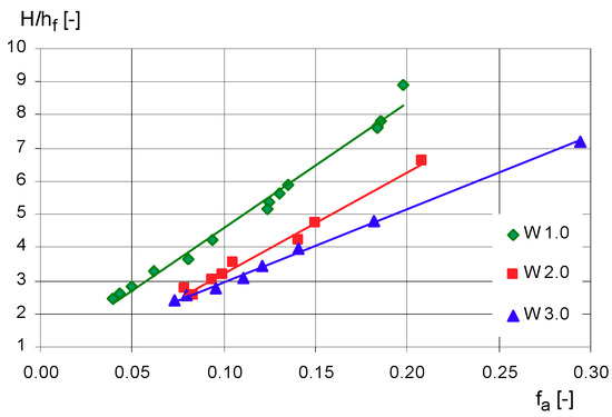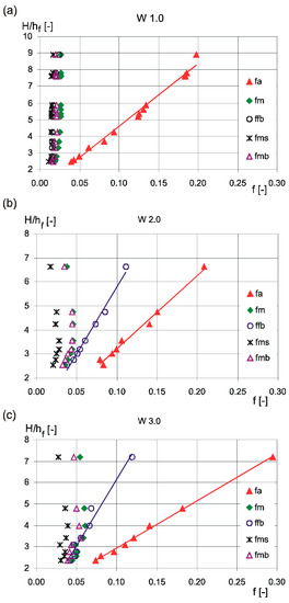 The values of the apparent resistance coefficients for the compound cross-section in variants W 1.0, W 2.0 and W 3.0, and resistance coefficients of the bottom of the flood plain ffb with high roughness (in variants W 2.0 and W 3.0) decrease with the increase of the flow depth (with reduction of the ratio H/hf). Changes in these resistance coefficients are explained with linear regression equations and are shown in Figure 6. In contrast, values of resistance coefficients for the entire main channel fm, fms slopes and bottom of the main channel fmb in all variants of the study and the floodplain ffb in the W 1.0 variant, do not change significantly with depth, which is why their average values were calculated (Figure 6).