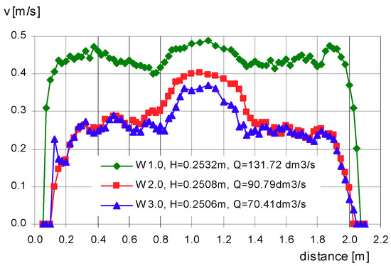 Distribution of average velocity in verticals in W 1.0, W 2.0 and W 3.0 variants with similar flow depths in the channel.
