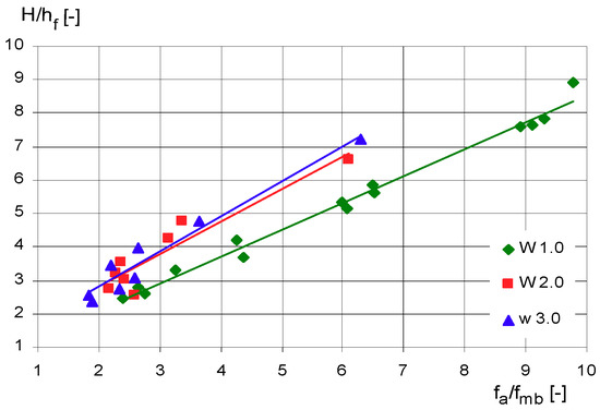 Figure 9 presents the variability of ratios of the apparent resistance coefficients to the coefficients of the bottom of the main channel fa/fmb in respect of the relative depth H/hf obtained from the conducted experiments.