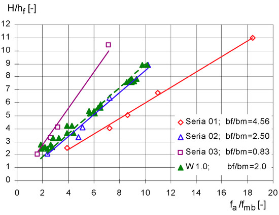 Since the values of the apparent resistance coefficients also depend on the width of the floodplain and the main channel (2), it was decided to identify such a dependence. This was done on the basis of results reported in the literature. Bretschneider and Özbek (1997) [16] calculated the apparent, and those for the bottom of the main channel, coefficients of resistance, on the basis of measured apparent shear stresses, in experiments performed on large scale models of a compound channel as part of the SERC program at the Hydraulic Research Laboratory in Wallingford, England. The ratios of apparent and bottom resistance coefficients from their own experiments in the variant W 1.0 were compared with the results of the Bretschneider and Özbek calculations (1997) [16] for a series of tests performed in a smooth two-section channel with 1:1 side slopes, and different ratios of floodplain and the main channel widths bf/bm, and these are shown in Figure 10. The dependencies presented there show that the increase in the width of the floodplain in relation to the width of the main channel significantly affects the discussed ratio of resistance coefficients. This effect decreases with the increase of the flow depth. The character of changes in the resistance coefficients of fa/fmb as a function of ratios of depth H/hf and the widths of the floodplain and the main channel bf/bm from our own research, presented in Figure 10, is explained by the regression equation: