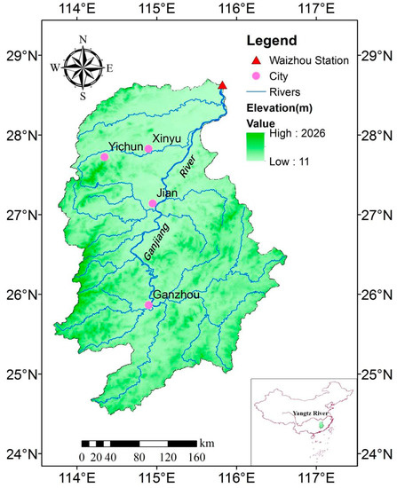 The Ganjiang River, which is the largest tributary of the Poyang Lake basin, is situated in Jiangxi Province (in Southeastern China) with a drainage area of 83,500 km2 (Figure 1). This study area belongs to hilly region with the main land use type of woodland [33]. The Ganjiang River basin is located in the subtropical humid monsoon climate zone with distinct seasonal variations, where the annual mean precipitation is about 1680 mm. The heaviest rainfall occurs in the main flood season from April and June, and often lasts 15 to 20 days due to monsoon and typhoon rainstorms [34].