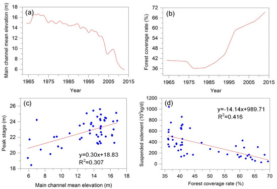 Data analyses of four variable series in the Ganjiang River basin (GRB) during 1964–2013. (a) is evolution of the main channel mean elevation (MCE) at Waizhou station, (b) is evolution of forest coverage rate (FCR) of the GRB, and two correlation plots are between peak water stage (Z) and MCE (c) and suspended sediment load (S) and FCR (d), respectively. R2 value is the square of the correlation coefficient.