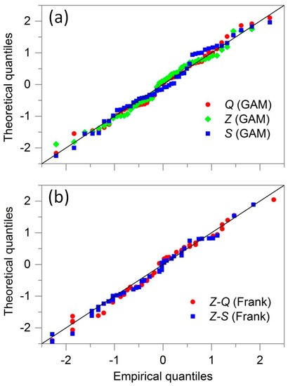Since annual peak discharge displays stationarity during 1964–2013, Q is fitted by five candidate distributions with all parameters treated as constants. In fitting Z and S series by nonstationary models, there are three main possible situations for each candidate distribution: (1) only the location parameter is time-varying, (2) only the scale parameter is time-varying and (3) both the location and scale parameters are time-varying. The final distribution model for each candidate is determined from the three models above by the selection criterion of AICc (i.e., model with the minimum AICc is the best). For the three flood variables Q, Z and S, the estimated parameters and the results of the GOF test of all candidate marginal distributions are summarized in Table 3. The P-value of the KS test was simulated using the Monte Carlo method. All the distributions pass the KS test at the 0.01 significance level. According to AICc, the most appropriate marginal distributions of Q, Z and S are Gamma distribution. The location parameter of the Gamma distribution for describing Z is positively related to MCE, whereas the scale parameter is constant. Meanwhile, both location and scale parameters of the Gamma distribution for describing S are positively related to FCR. The QQ plot (Figure 3a) of the best fitted distribution indicates that these selected distributions have a quite good fitting quality.