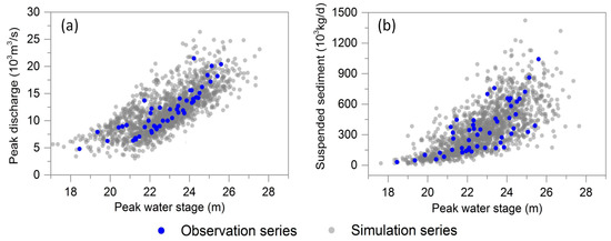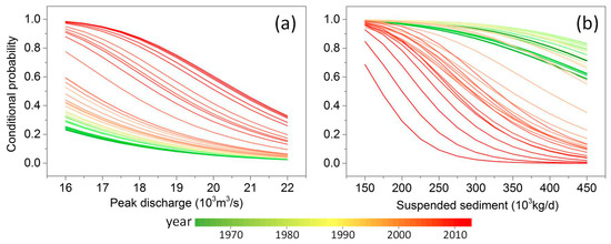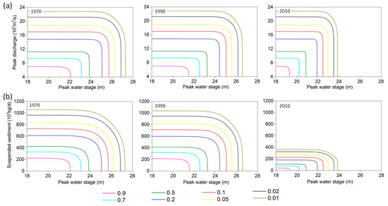 To display the time variation of flood variables with given water stage, the conditional probability of peak discharge or suspended sediment load could be derived from the joint probability as Equation (9). The conditional probability based on nonstationary bivariate copula can be expressed as follows: