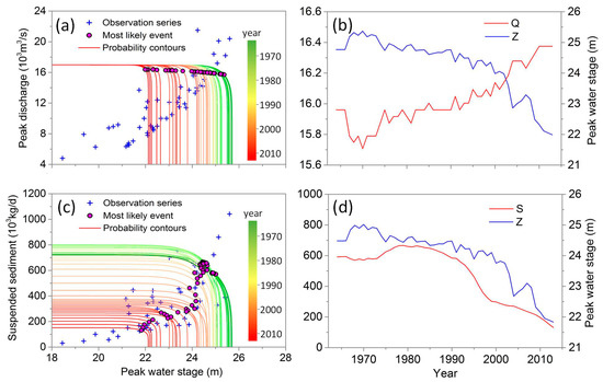 As shown in Figure 6, the temporal variations of joint probability as Equation (9) are assessed for each time step from 1964 to 2013. Meanwhile, the magenta dots on the probability contours represent the corresponding the most likely combination derived from Equation (10). The probability contours cover a broad range, with marginal values ranging from 22.12 m to 25.06 m for Z and 721.78 × 103 kg/day to 151.58 × 103 kg/day for S. It can be seen that the suspended sediment load is more sensitive to flood event than the peak water stage from comparison of their value ranges. For the most likely combination, the peak discharge at Waizhou station in the Ganjiang River displays a slight increasing trend from 15.97 × 103 m3/s to 16.41 × 103 m3/s over time, while the values of peak water stage and suspended sediment load have obviously decreased, especially in the last decade. As shown in Figure 6b,d, it is indicated that Z and S in the most likely combination are obviously affected by riverbed down-cutting and the change of forest cover, respectively. Moreover, since the dependence structure of Z-Q is nonstationary as Equation (12), Q in the most likely combination is impacted by riverbed down-cutting as well.
