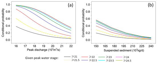 What is more, the proposed method also allows us to obtain more information concerning the conditional probabilities under various given water stages. Figure 8 has shown the results, where MCE and FCR are assumed to be 6 m and 70%, respectively. The conditional probabilities become bigger for both Q and S with the higher peak water stage. When values of Q and S become bigger, the differences of conditional probabilities are getting smaller under various given water stages, especially for (Figure 8b). In addition, the conditional probability is more sensitive than on condition of various water stages at Waizhou station. Those results can give us quantitative information about temporal variation of flood variables under the changing environments in the Ganjiang River basin.