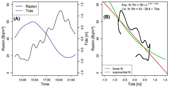 Figure 2. Exemplary 12 h time series of radon and associated tidal stage; (A) Dependence of radon concentration on the water level at a fixed location in the Gordon’s Bay harbour area; (B) Exponential regression and linear data fit.