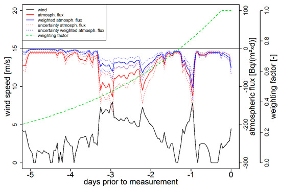 F atm   [ Bq   m 2   d 1 ] = t = 0 t max   [ w   ( t ) × F atm ( t ) ] t = 0 t max   w   ( t )