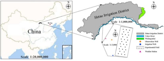 Field experiments were carried out in the Agricultural Experimental Station of Inner Mongolia Agricultural University, Hetao Irrigation District, Bayan Nur (107°18′ E, 40°41′ N), which is located in the south of Linhe city, north of Yellow River (Figure 1). The study area is a typical temperate continental climate characterized by drought and high temperatures in summer, and is snowless and cold in winter. The annual average precipitation and evaporation in the region is 141.2 and 2306.5 mm, respectively. Since the main light energy, heat energy, and precipitation all occur in the same period, HID is relatively suitable for the development of agriculture.