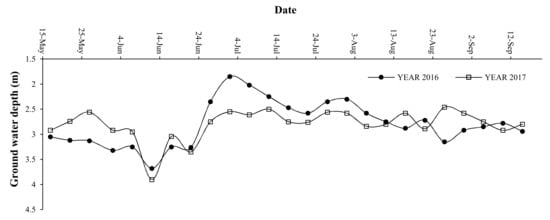 The buried groundwater depth in the research area during the growth period of sunflower is 1.85–3.68 m, the average value is 2.80 m, and the detailed variations are shown in Figure 2. The maximum buried depth appeared in mid-June, while the minimum value appeared in early July, and groundwater had a certain impact on sunflower growth, which lasted about 50 days from July. As the main resource of traditional ground irrigation, the Yellow River water generally has annual average salinity of 0.505 g∙L−1, while the shallow ground water has an annual average salinity of 3.14g∙L−1, which is suitable for farmland irrigation []. The main composition and characteristics of local shallow groundwater and Yellow River water are shown in Table 3, and the precipitation during sunflower growth period in 2016 and 2017 is shown in Figure 3.