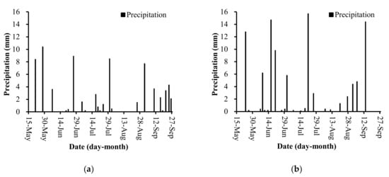 The precipitation during sunflower growth period. (a) Precipitation during sunflower growth period in 2016; (b) Precipitation during sunflower growth period in 2017.