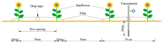 A vacuum gauge tensiometer was installed at 20 cm depth immediately under the emitters for SMP monitoring and irrigation in each plot. The tensiometers were observed three times a day at 8:00, 12:00, and 18:00 during the whole growth period of sunflower.