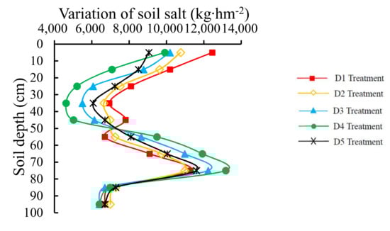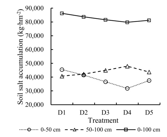 Potentially affected by irrigation leaching, crop water uptake, and the salt-carrying effects of irrigation water, the soil salinity between different treatments showed obvious differences (Figure 5 and Figure 6). The soil layers for all treatments in the film were salinized, which indicated that the influence of crop water uptake and the salt-carrying effects of irrigation water were stronger than the irrigation leaching effect under the designed irrigation schedule, while the accumulation of soil salt in soil layers decreased first and then increased with the increase of soil depth. Moreover, the inflection points for variation curves between soil salinity and soil depth were at 30–40 cm and 70–80 cm underneath the surface. Additionally, the accumulated salt in the top soil for D5 treatment was the lowest in the designed treatments, while the corresponding salinization for D1 treatment was the highest. Furthermore, the accumulated soil salt in the main root zone of sunflower for treatments follow the rule of D1 > D2 > D5 > D3 > D4. According to the fact that soil salt accumulated in the sunflower main root zone, the superiority of the planting pattern with 50 cm row spacing and 35 cm plant spacing was suggested to be better for crop, due to the lower soil salt content in 0–50 cm.