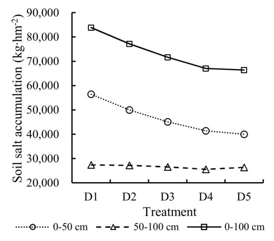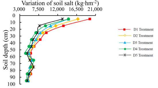 As influenced by soil evaporation, the soil salt accumulated between neighboring films, moreover, the variation of soil salinity decreased with an increase in soil depth (Figure 7 and Figure 8). In particular, the soil salt accumulated sharply in 0–20 cm, while at harvest stage of sunflower, the accumulated soil salinity in 0–20cm for the five treatments D1, D2, D3, D4, and D5 was 28.44, 24.43, 21.46, 20.42, 17.97 g∙kg−1, respectively. Meanwhile, the varied soil salt content in 20–100 cm for the designed treatments, D1, D2, D3, D4, and D5, was 10.65, 10.21, 9.77, 9.03, 9.51 g∙kg−1, respectively, which indicated that, due to the capillary force, deep soil salt moved upward with soil moisture, and soil salt remained after top soil moisture evaporation. Furthermore, the accumulated soil salt had little difference for the designed densities at 50–100 cm.