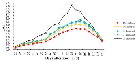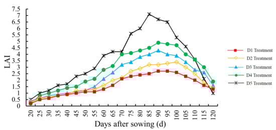 The variation of LAI with time after sowing for all treatments were approximate dynamic parabola curves (Figure 9 and Figure 10), which slowly increased with time at the seedling stage, and then rose sharply when the sunflower budded, and then reached a maximum value at peak flowering period; he LAI then decreased rapidly with time. There was little difference for the treatments at seedling stage, while the diversity increased after budding, and the most significant differences appeared during the peak flowering period, and then diminished. The LAI of sunflower generally decreased with an increase of plant density during the whole growth period, while the LAI of higher plant densities decreased more sharply at the latter stage. The results indicate that the effect of population on leaf area was significant at the early growth stage of sunflower, while the effect of plant density on a single plant increased with the growth of plants. The leaf area per plant decreased with the increase of plant density, while smaller plant spacing usually resulted in canopy closure and severe shading, which generally caused premature withering of the bottom leaves. As the LAI of sunflower has effects on the process of photosynthesis, transpiration, and dry matter accumulation, measures such as plant density regulation should be taken to obtain the maximum light interception for the highest growth rate of sunflower [,].