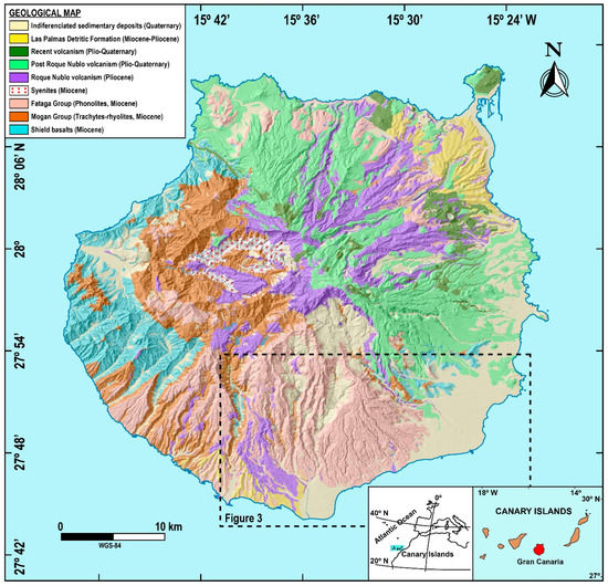 - IGME. ITGE Geological Map of Spain, Island of Gran Canaria (Mapa Geológico de España, Isla de Gran Canaria); Geological and Mining Institute of Spain (IGME): Madrid, Spain, 1992. [Google Scholar]