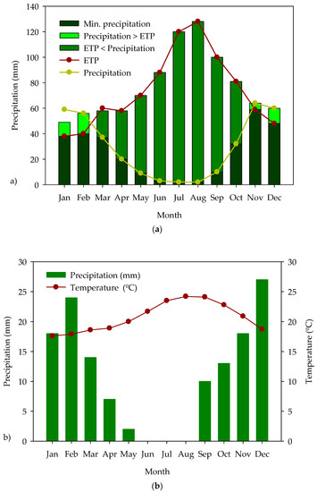 Annual variation of some climate parameters in the Island of Gran Canaria averaged over a 30 year period (from 1980s to 2010s): (a) precipitation and evapotranspiration (ETP) values, as well as the minimum (min) effective precipitation values and the time intervals during which ETP exceeded rainfall and vice versa; (b) rainfall and temperature.