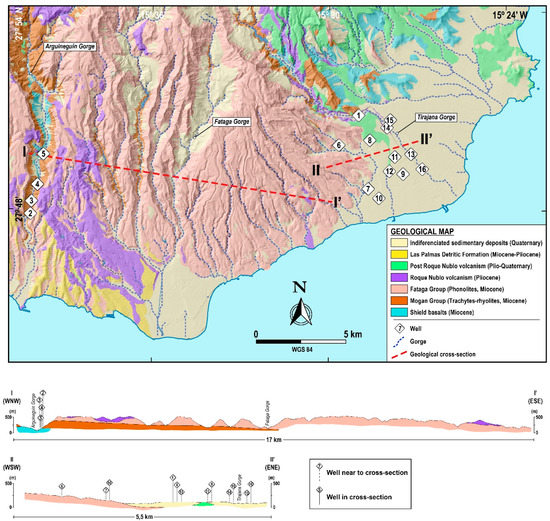 The archipelago′s magmatic history is quite long-drawn-out throughout times, with the first underwater volcanic manifestations starting some 35 million years ago. Since then various geological processes have taken place, involving those phenomena resulting from underwater volcanism and those from sedimentation, in different environments [11,15]. The formation period of the part of the island above sea level stretches from the Upper Miocene almost up to the present time. During those 14 million years, there has been a succession of various igneous occurrences alternating with erosive periods. The formations presenting a hydrogeological interest that constitute the area under review are characterized by a high silica content (≈60%) and a clear predominance of alkalies (Na, K) [16,17].