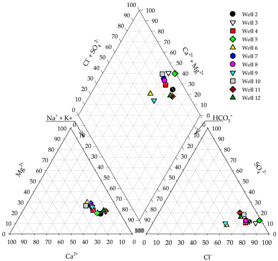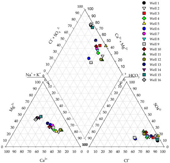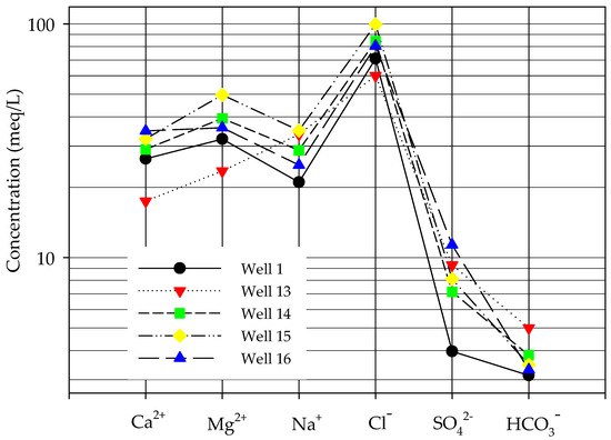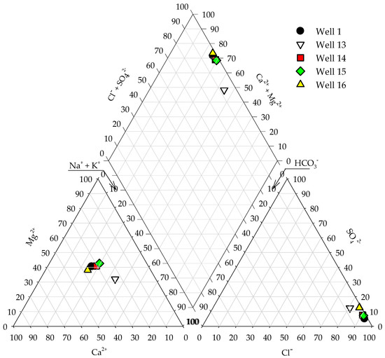 The waters belonging to this type are those from wells 1, and 13–16. In this area, the underground water is fairly mineralized, with considerable hardness. Conductivity levels were very high, ranging between 6500 and 11,700 µS/cm. These wells present high salt contents. In this case, all the waters are of the Cl-Ca type (Figure 5). Due to high levels of salts in such waters, these waters would be deemed considerably hard. These high levels of salts may be the result of the prolonged interaction between the water and the rock, since, according to [32], the water resources in this area are at least 10,000 years old, and it is possible for the salts from the rocks to have gradually dissolved. It can also be observed that the level of sulfates is high, exceeding the limit set by the Spanish legislation in force [44] (Table 6), i.e., 250 mg/L. Well 1 is the only one not to exceed this limit.