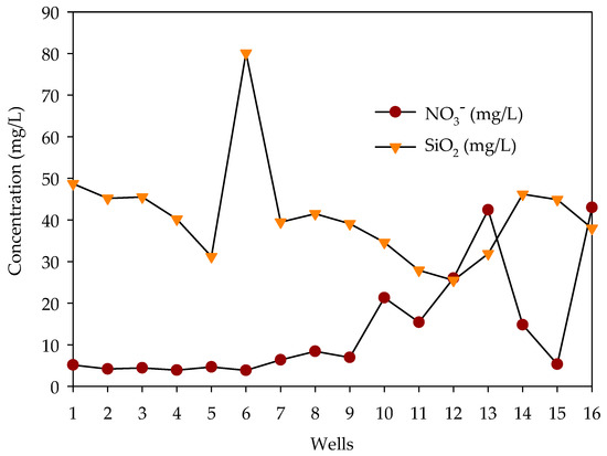Furthermore, all the wells are characterized by a high concentration of silica, between 30 and 50 mg/L on average, with the exception of well 6, which shows a mean value of 80.1 mg/L, with a maximum of 94 and a minimum of 47 mg/L. Figure 7 shows the mean values of the nitrates and silica levels for all 16 wells during the whole testing period. This phenomenon is due as much to the hardness of the water as to the location of the wells, which are situated in an area where the bedrock, for the most part, is characterized by a high silica content and the prevalence of alkalines [16,17,43].