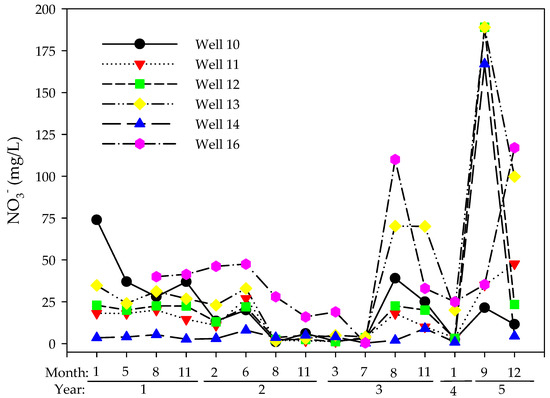 Figure 7 also illustrates the mean concentration of nitrates inside the wells, which shows that, in wells 1–9 and 15, contamination due to nitrates was minimal (maximum mean value of 8.41 mg/L in well 8), and their concentration levels remained constant, whilst in the other wells, the average concentration rose sharply during the research period. The majority of the highly contaminated wells are situated in the Tirajana Gorge, an area where the land is cultivated more intensively. Figure 8 presents the variations in the levels of nitrates from wells 10–14 and 16 during the sampling period (including in which month the samples were collected). A significant variation in the levels of nitrates can be observed in wells 12, 13, 14 and 16. Well 12 presents a minimum value of 1.2 mg/L in the sample taken in August and a maximum of 189 mg/L for the month of February. The same phenomenon is occurring in the other wells, where we have variations in the levels of nitrates of up to two orders of magnitude, with the exception of well 15, where the values range from 1.3 to 47.7 mg/L. This was linked to the intensive use of the land for agricultural purposes in the area. Wells 12, 13, 14 and 16 are located in an area of intensive land cultivation (Figure 3), whilst wells 10 and 11, which are situated in the same gorge, are located further from this cultivated area. It is worth mentioning that these wells are located on higher ground (cf., Figure 3).