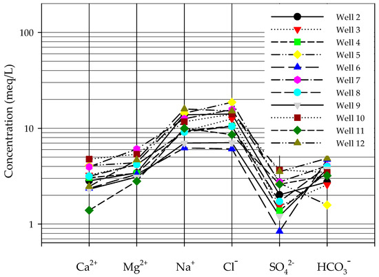 When representing the Schoeller diagram for these wells (see Figure 10), we see the distribution of the majority ions, which is much less in this case. It can be observed that, even though ion levels are much lower, sodium and chloride ions are high, whilst bicarbonates and magnesium, calcium and sulfates are slightly lower, in general.