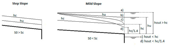 The abovementioned initial conditions in steady flow that were required for the new downstream boundary conditions tested and presented in this paper were modeled and implemented on a computer. The corresponding normal and critical depths of flow and the gradually varied profiles of the steady flows are represented schematically in Figure 1. In practice, due to the curvature of trajectories, it can be observed that the flow depth reached in the end section is lower than critical depth, with a ratio of about 1/1.4 [40], see Figure 1 d), but this fact is rarely mentioned or considered.
