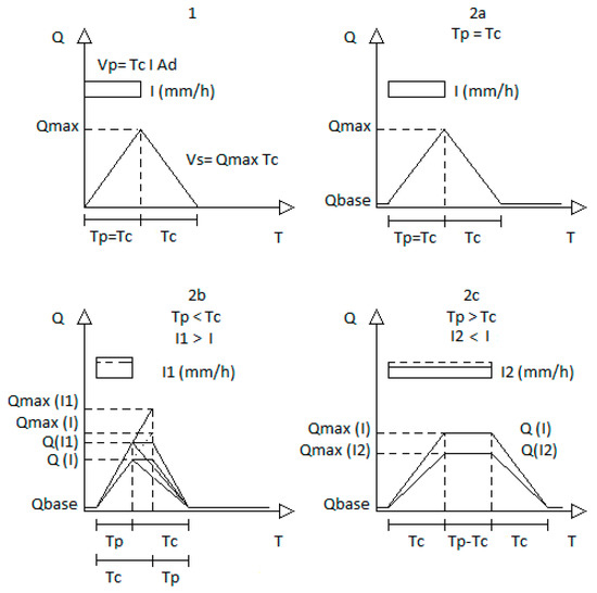 C is the runoff coefficient, a non-dimensional coefficient that is the ratio between the maximum direct flow per unit area drained and the maximum average intensity of precipitation that makes such a maximum flow occur, with a duration of Tp = Tc. In other words, in the classic formulation, C is the quotient between the volume of surface runoff, Vs, and the total volume of the precipitation, Vp = I (Tr, Tc) × Tc × Ad, assuming implicitly a hydrograph triangular symmetric of base 2 Tc [46,48,49]. See Figure 2 (1,2a), in which the triangular hydrograph is adapted to include a very small or residual base flow, required for the numerical integration performed. The basic simplifications [19,20] are that the maximum flow occurs when the whole of the drainage basin is contributing to the flow; the assumption of linear relations between the maximum flow and both the area of the drainage basin and the maximum average intensity of precipitation; that the rainfall is constant during Tc and in the physical space of the basin; and that the maximum flow and the maximum rainfall have the same period of return (which is normally defined in urban hydrology as the average time interval in years in which a selected occurrence is equalized or exceeded). The smaller the basin, the more acceptable these approximations, and thus the method loses validity for basins of large dimensions.