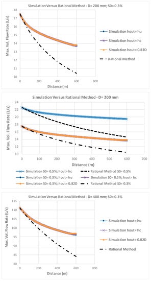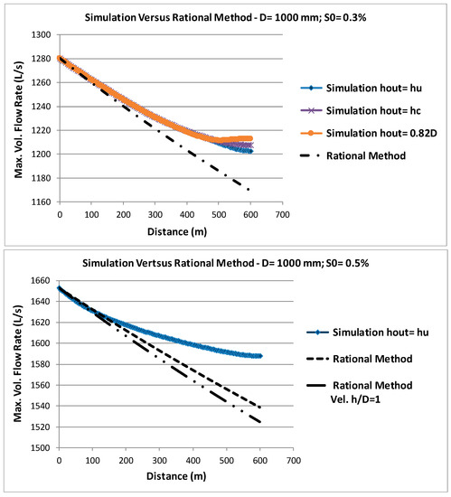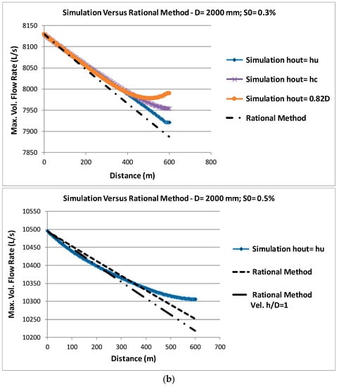 For all situations tested, the peak flows reached in each section considering the rational method are clearly all below the peak flows reached with the simulation for comparable conditions. In other words, the reduction in the peak flow using the conventional rational method is larger than the effects of storing, propagation, and attenuation obtained in sewers with the simulation, and the rational method underestimates the peak flows. The average velocity considered along all sewers for calculating the time of concentration was the maximum in the upstream extremity in real conditions (h/D = 0.82). The comparison with the velocity for the full section (at h/D = 1, the average velocity is slightly lower), which decreases the time of concentration and consequently decreases the peak flows reached along the sewer even more, is shown in Figure 3b for S0 = 0.5% and the larger diameters of 1 and 2 m. In both cases, they were considered constant along the pipe length, which is on the safe side, otherwise the peak flows obtained with the rational method would decrease even more.